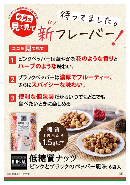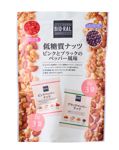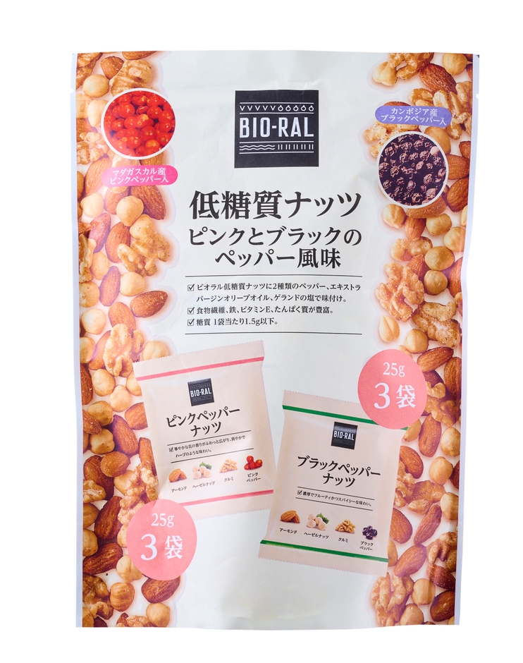 “おいしい” “ワクワク” “ハッピー” をお届けするライフコーポレーションは、体に優しい素材や製法、健康や自然志向にあわせたプライベートブランド“BIO-RAL”より「低糖質ナッツ ピンクとブラックのペッパー風味」を、8月に新発売いたしました。