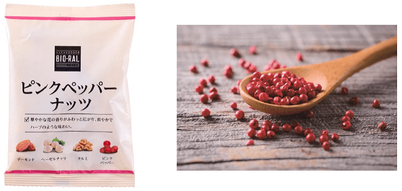 ライフが自信を持っておすすめする「今月の見て見て」の9月商品に選ばれた「BIO-RAL 低糖質ナッツ ピンクとブラックのペッパー風味」は、「マダガスカル産ピンクペッパー」と「カンボジア産ブラックペッパー」を使用した「BIO-RAL ナッツシリーズ」の新商品です。これまで販売していた素焼きの商品に加えて、ピンクとブラックそれぞれのペッパーの香りがクセになる新フレーバーが誕生いたしました。
