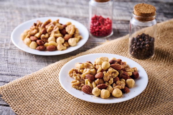 アーモンド・ヘーゼルナッツ・クルミが入ったミックスナッツを、2種類のペッパー・エキストラバージンオイル・ゲランドの塩で味付けしました。