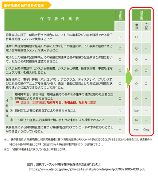 改正前の厳格な要件を満たしていなくても、正規の簿記の原則(一般的には複式簿記を指す)に従って記録される電子帳簿については、下表の「その他」の要件を満たすものであれば電子データによる保存ができることとされました。
