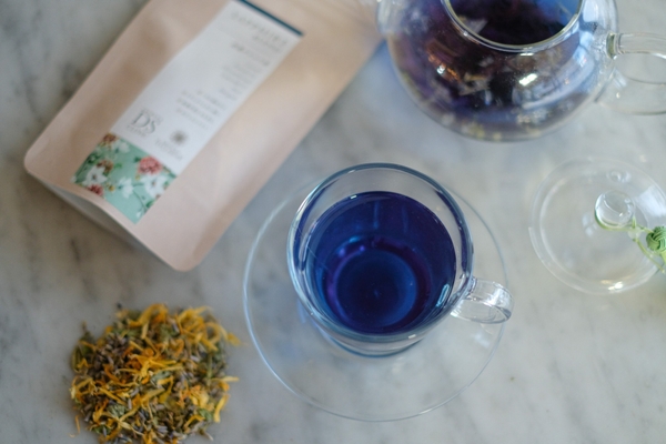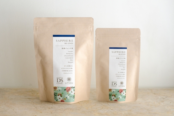「サファイアブレンド」は、華やかな香りのラベンダーや、アジアでよく飲まれておりアンチエイジングも期待できると言われるアントシアニンを含む青いお茶のバタフライピーティーをベースに、渋谷DSクリニックでも使われている菊花やミント、レモンマートル、マリーゴールドをオリジナルでブレンドしました。