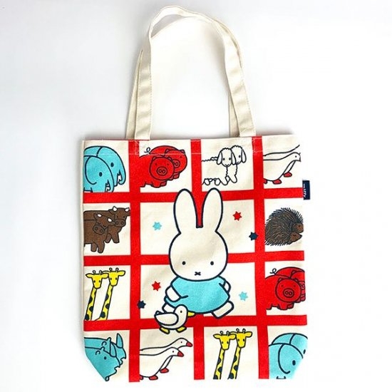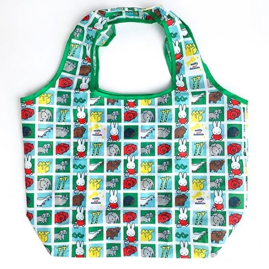 グリーンやレッド、イエローなどの原色遣いがカラフルでかわいい、ミッフィーのエコバッグです。お馴染みのミッフィーのほかに、絵本にも登場するゾウやキリン、ブタなどのアニマルズが大集合。縁取りのグリーンも効いていて、とっても楽し気なデザインです。