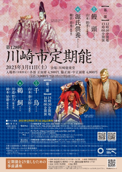 公益財団法人川崎市文化財団主催、『第128回川崎市定期能』が2023年3月11日(土)に川崎能楽堂(神奈川県川崎市川崎区日進町1-37)にて上演されます。チケットはカンフェティ(運営:ロングランプランニング株式会社、東京都新宿区、代表取締役:榑松 大剛)にて2月6日(月)より発売中です。