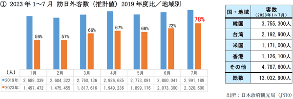 2023年1~7月のトップ3は韓国、台湾、米国。8月10日付の中国における海外旅行制限措置の撤廃に伴い、8月以降のさらなる回復が見込まれる。