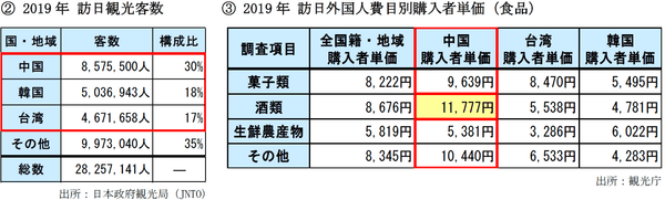 <コロナ前の国別訪日観光客数と購入単価>