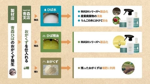 弊社では”青森ひば精油”を使用した商品を”ニオイトリMASHシリーズ”として、お掃除・洗濯・消臭・除菌といった用途でご家庭でお使い頂ける製品にし、販売していく他、精製段階で産出される“青森ひば水”は法人向けサービスとして、りんご農家の方へ納品し、木が腐らないように、虫が寄らないようにりんごの木に撒いたり、青森ひば精油と青森ひば水を取り出した後のおがくずは堆肥として化学産業などでも利用されています。