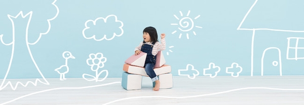 ▼背景/『iebito(いえびと)』 の“やわらかい巨大積木” 『PLAYクッション』