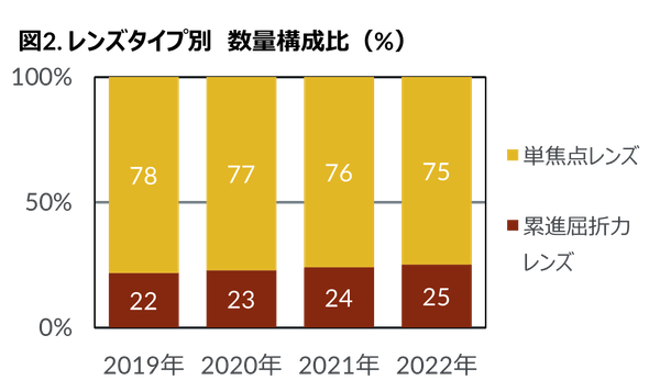 メガネレンズには、近視用や遠視用メガネに用いられる単焦点レンズと遠近両用メガネに用いられる累進屈折力レンズがあり、2022年の販売数量構成比は単焦点レンズが75%、累進屈折力レンズが25%となった。