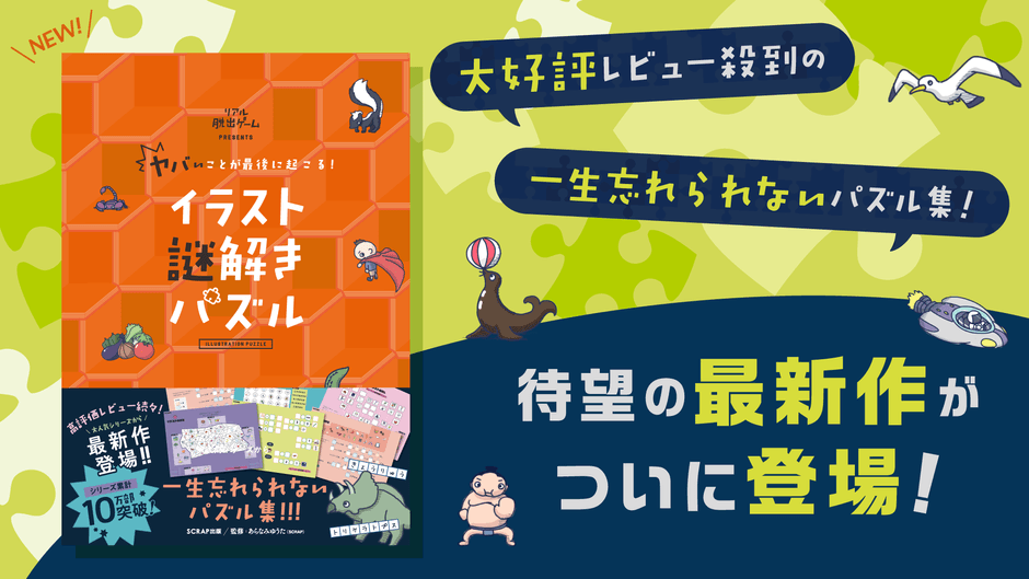SCRAPの人気シリーズ『イラスト謎解きパズル』最新作や、タンブルウィードが贈る大ボリュームの謎解きグッズ、フラップゼロアルファの新商品など、続々登場!