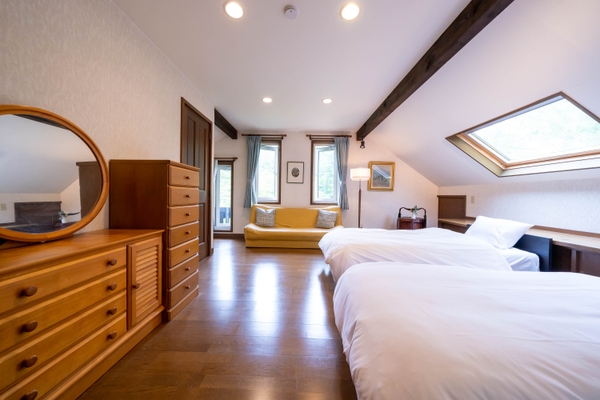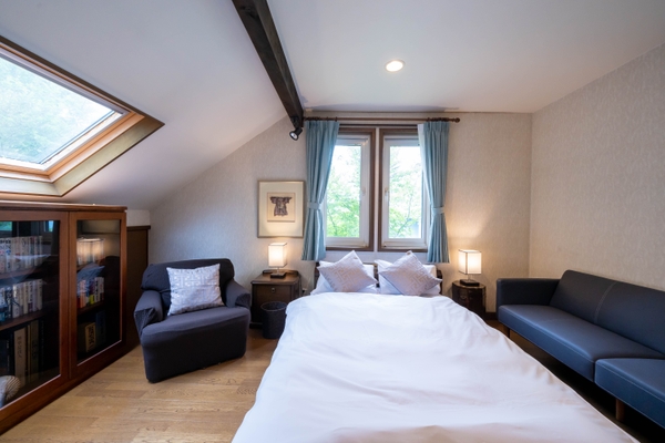 本施設は、2階建ての3LDK(約202㎡)の一戸建てで、大人数でも楽しめる本格的暖炉を備えたリビングダイニング(30帖超)と大自然の中でアウトドア気分が思う存分楽しめる広いウッドデッキが特徴的です。さらに、続き間の和室8畳、シャワールーム、玄関から和室につながる土間スペースなど、随所にオーナーのこだわりが散りばめられています。2階は南向きで、天窓を備えた日当たりのよい主寝室とゲストルーム、浴室が配置されています。さらに書斎スペースも二か所完備しているのでリゾートでくつろぎながら働くワーケ―ションにも最適な別荘となっています。