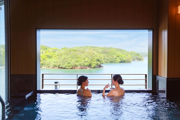 従来の露天風呂、大きなガラス窓が開放感たっぷりの内湯、そして半露天風呂。全ての場所から海を眺める空間に生まれ変わった女性大浴場。朝に夜に、時間と共に表情を変える英虞湾を眺める入浴をお楽しみください。