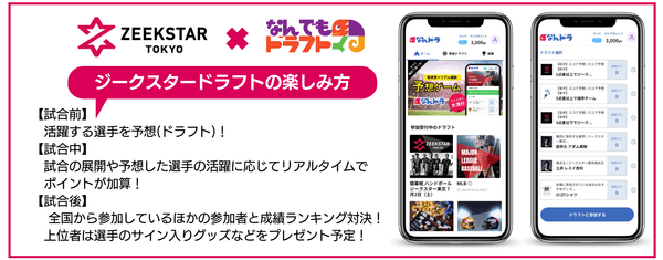 「ジークスタードラフト」ではゲーム参加者が試合の勝敗やスコア、チーム得点王などを予想して順位を競います。試合会場にいなくても参加でき、より多くのファンが試合の前から終わった後まで長く深く試合を楽しめます。