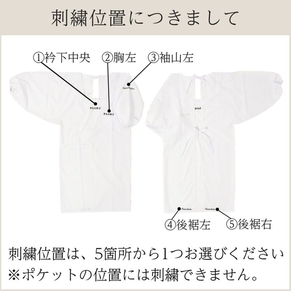 刺繍の位置は、襟下中央、左胸、左袖、裾下左、裾下右の5カ所の中から1カ所選べます。