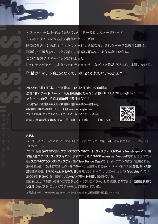 アーティスト・コレクティブ "A.P.I." は、2022 年 12 月、パフォーマンス・メディア・アーティスト/振付家・ 石山雄三の新作ダンス・パフォーマンス『S.S.S.S.』を、「R's アートコート」(新大久保)で発表する。