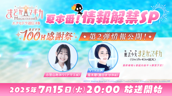 株式会社アニプレックス(本社:東京都千代田区 代表取締役 岩上敦宏 以下アニプレックス)は、『魔法少女まどか☆マギカ Magia Exedra』(Magia Exedra:マギアエクセドラ)の公式番組「魔法少女まどか☆マギカ Magia Exedra エクセドラ通信#8 夏本番!情報解禁SP ~ まどドラ100日感謝祭 第2弾&〈ワルプルギスの廻天〉 最新情報 ~」を7月15日(火)20:00〜生配信することを決定いたしました。