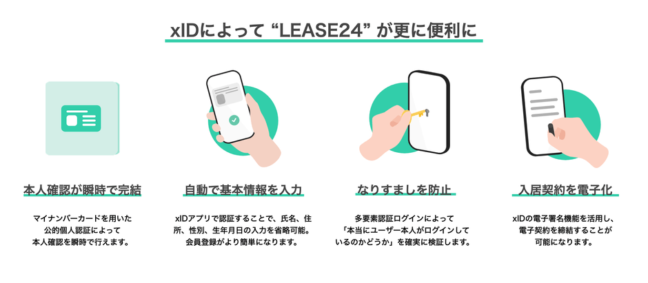 そのような課題を抱える中で、マイナンバーカードを用いた本人確認(公的個人認証)を行い、電子認証・電子署名までを一気通貫で行えるデジタルIDソリューション「xID」を提供するxIDとの業務提携に合意。上記の全ての課題を解決する手段として、「LEASE24」への「xID」の導入が決定いたしました。