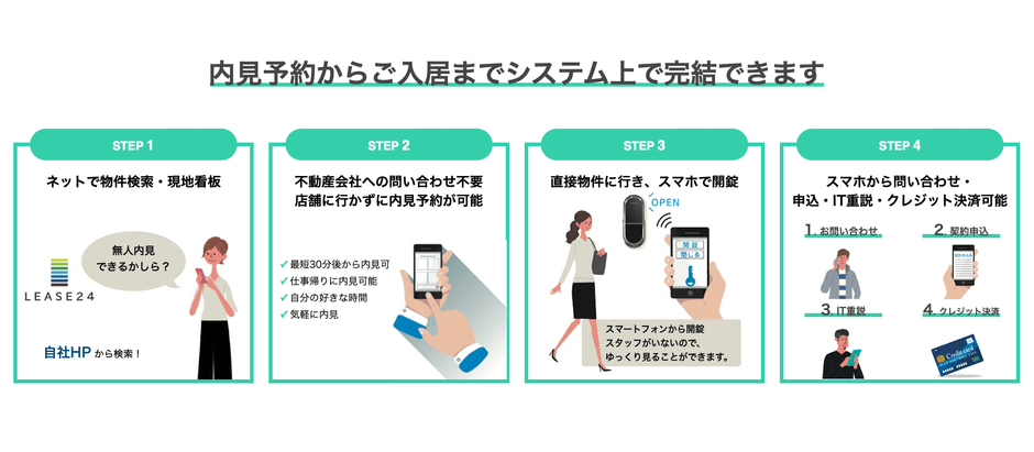 そんな状況に風穴を開けるべく、ショウタイム24は賃貸物件24時間無人内見システム「LEASE24」を開発し、会員登録から内見までを対面でのやりとりなしに完結できる仕組みを構築。2019年1月よりサービスを提供して参りました。