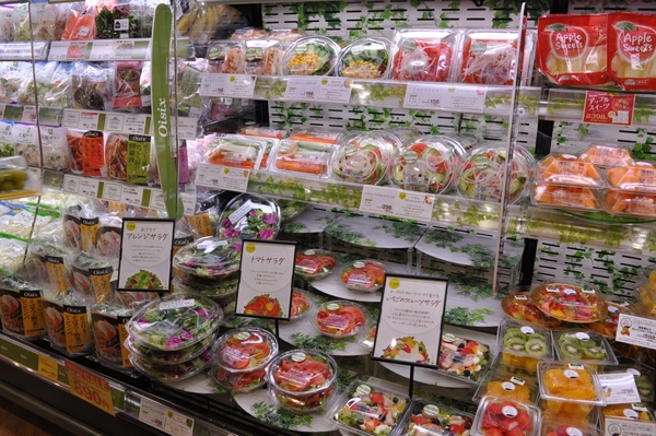 店内で野菜を彩りよく盛りつけた鮮度感あふれるサラダをご提供いたします。新商品の「チェリーのフルーツサラダ」も品ぞろえいたします。
