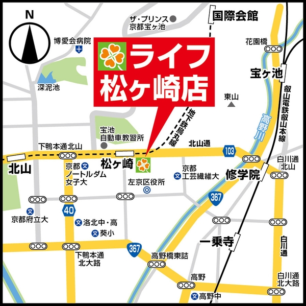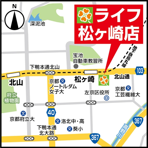 ・当店は、京都市営地下鉄烏丸線「松ヶ崎」駅前に位置し、京都市内の最北を東西に結ぶ「北山通」の南側に面しています。