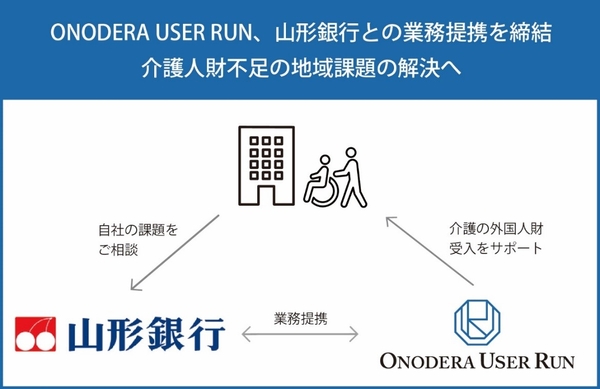 ONODERA GROUPの株式会社ONODERA USER RUN(代表取締役社長:加藤 順 所在地:東京都千代田区大手町1丁目1番3号)は、株式会社山形銀行(取締役頭取:長谷川 吉茂 所在地:山形県山形市七日町3丁目1番2号)と業務提携を結んだことをお知らせいたします。今後山形銀行には医療・福祉業界の顧客に対して当社のサービスをご紹介いただき、地域全体の課題である介護人財不足の解消に向け、一丸となって進んでまいります。