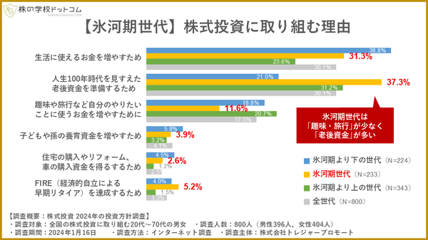 これに対して氷河期世代では、「人生100年時代を見すえた老後資金を準備するため」が37.3%と最も多くの回答を集め、「生活に使えるお金を増やすため」の31.3%がそれに続きます。