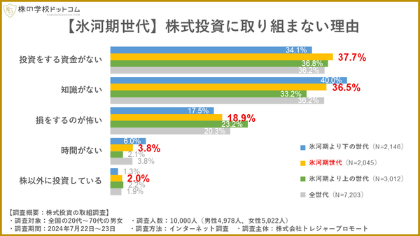 昨今話題にのぼることの多い「就職氷河期世代」は株式投資にどう向き合っているでしょうか。オンライン株式スクール「株の学校ドットコム」(運営会社:株式会社トレジャープロモート、東京都千代田区、代表取締役社長:瀬川 丈)では、氷河期世代の株式投資への取り組みについて過去のアンケートをもとに分析調査を行いました。