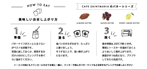 カフェサンタマリア三宮店、カフェサンタマリア和みの各店で人気のモーニングメニュー「アーモンドトースト」で使用しているアーモンドバターをはじめ、丁寧に、シンプルに、手作りにこだわった3種の自家製バターがご自宅でもより美味しくお楽しみいただけるよう新しくなって再登場しました。