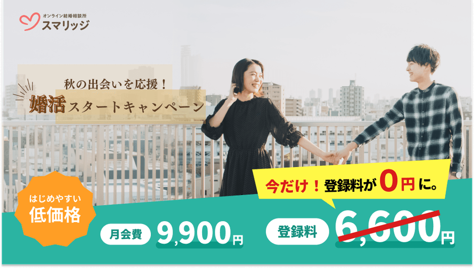 そしてこの度、スマリッジでは秋の出会いに向けて、たくさんの方に婚活をスタートして頂けるよう「秋の出会いを応援!婚活スタートキャンペーン」と題し、期間内のご登録の方へ通常6,600円(税込)の「登録料」が「0円」になるキャンペーンを実施いたします。ぜひこのお得な機会にスマリッジをご利用ください。