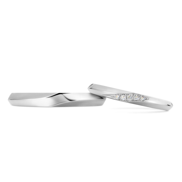 このほどの新作は、ストレートのラインのリングにデザインした緩やかな面が特徴です。エレガントに輝くメレダイヤモンドを留めたタイプと、落ち着いたつや消しを施した2種類が登場します。