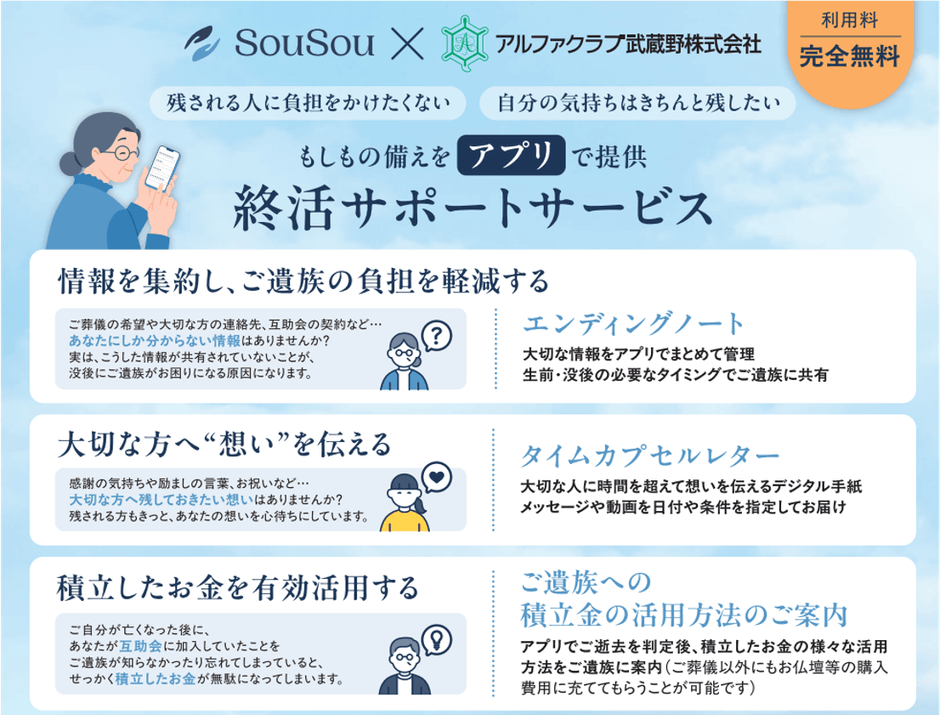 終活アプリ「SouSou」、葬儀会社大手アルファクラブ武蔵野との「外部サービス連携」開始。 互助会会員様の終活情報をご遺族へ確実に伝える新サービス。