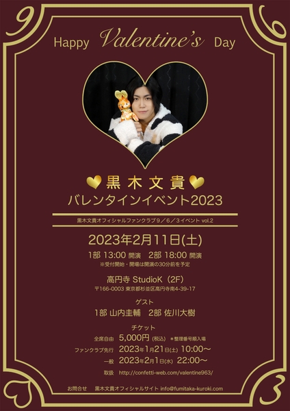 『黒木文貴バレンタインイベント』が2023年2月11日(土) にStudio K (Studio 2) (東京都杉並区)にて開催されます。チケットはカンフェティ(運営:ロングランプランニング株式会社、東京都新宿区、代表取締役:榑松 ⼤剛)にて2月1日(水) 22:00より一般発売開始です。