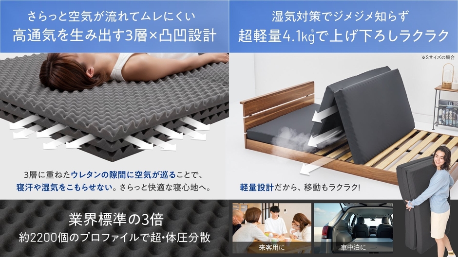 凸凹形状のウレタンが空気の流れをつくり、湿気や寝汗をため込まず、快適な寝心地を一晩中キープします。高温多湿な日本の気候に適した通気性設計で、季節を問わず快適に使えるのも魅力です。さらに重量は約4.1㎏(シングルサイズ)と軽量で、三つ折り構造のため持ち運びや収納もスムーズ。使わないときはコンパクトにたたんで収納でき、省スペースでも有効活用できます。