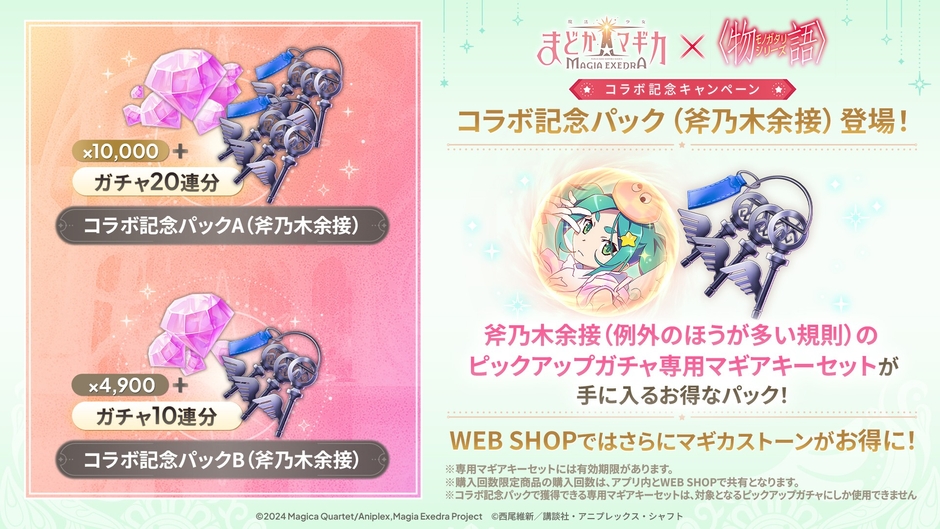 ※〈物語〉シリーズコラボピックアップガチャ専用マギアキーセットは、現在開催中の忍野忍ピックアップガチャ、八九寺真宵ピックアップガチャ、斧乃木余接ピックアップガチャにご使用いただけます。