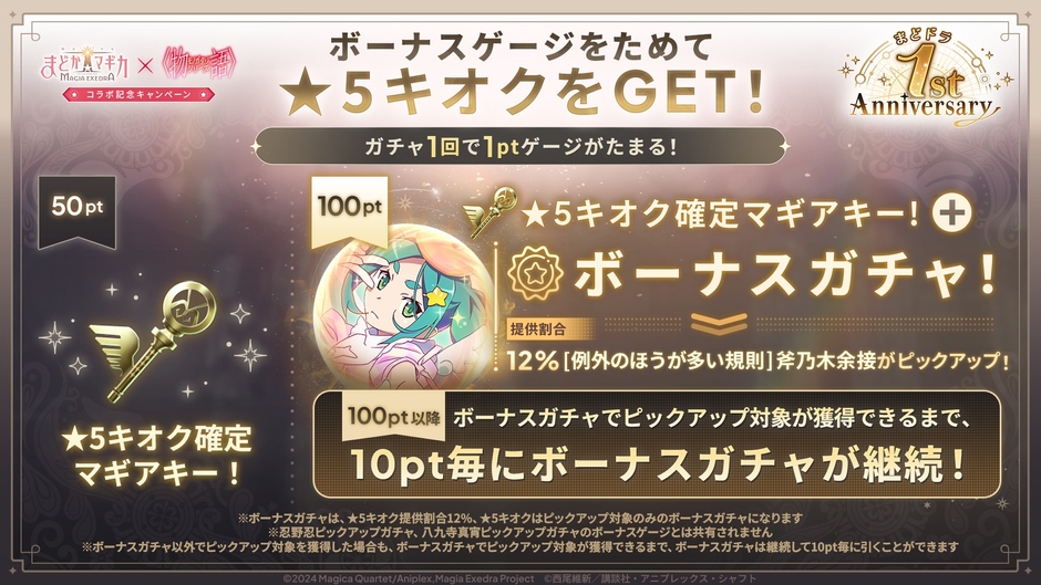 ログインやミッションを達成することで、〈物語〉シリーズコラボピックアップガチャ専用マギアキーセットを100連分獲得できるキャンペーンを開催中です。