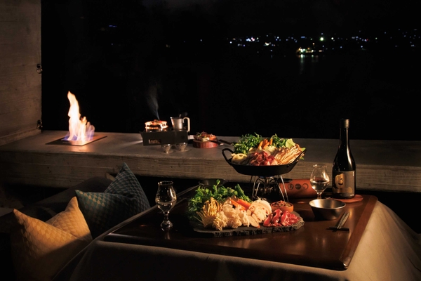 本プログラム限定の食事をキャビンで提供します。2日目の朝食は、日本酒づくりに使用される酒米で作る甘酒粥をメインとした和朝食です。夕食には、猪肉や季節の野菜に、甘酒と豆乳を使った出汁を合わせた「甘酒ぼたん鍋」と、料理の味わいに合わせた日本酒を用意します。グランピングマスターのサポートのもと、「野燗炉(のかんろ)」と呼ばれる、屋外で燗を楽しむ際に使用する調理器具で串焼きを仕上げ、日本酒を好みの温度に温めて味わいます。食事を通じて、日本酒の原材料や温度による味わいの変化について、楽しみながら学べます。