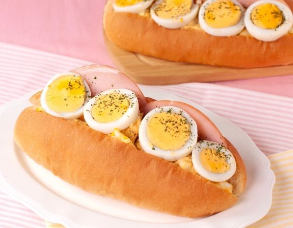 商品特徴:たっぷりサンドした卵サラダの上に、さらにゆで卵をトッピング!限界突破の卵サンドです。(※要冷蔵)