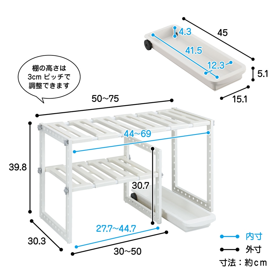 ■製品サイズ / 【フリーラック】幅33~50×奥行30.3×高さ30.9cm、【スライドトレー】幅15.1×奥行45×高さ5.1cm