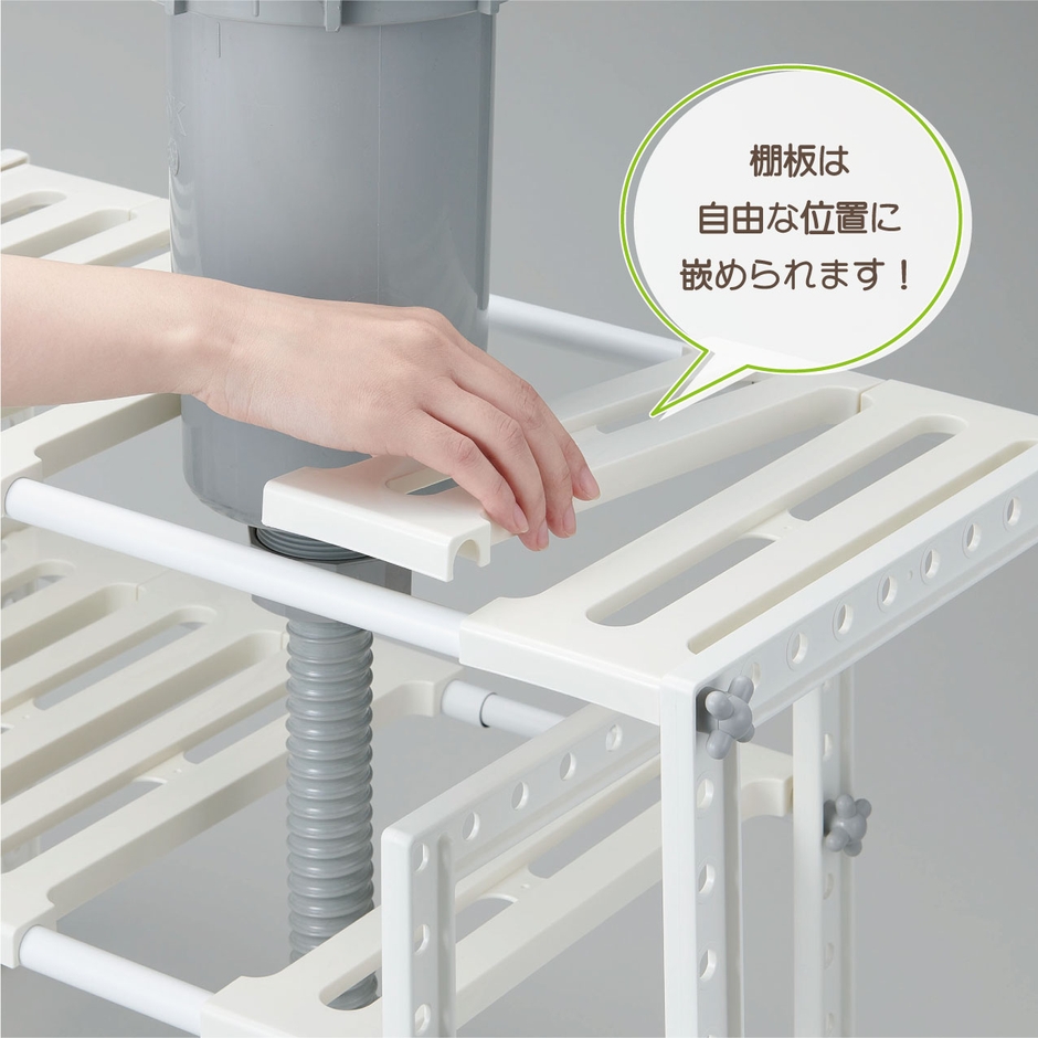 棚板が取り外しできるので、シンク下の排水トラップを避けて棚が作れます。
