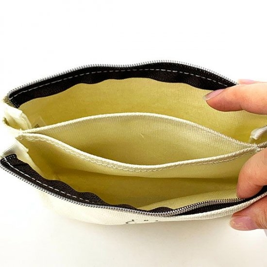 ファスナーを開けるとこんな感じ。2つのポーチをまん中でくっつけたことによって、3つの空間ができました!それぞれしっかり深さがあるので、中で物が混ざりにくいのが嬉しい☆