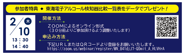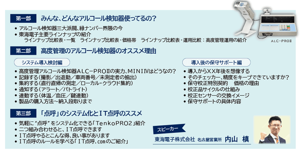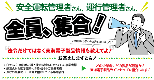 飲酒運転防止のためのアルコール検知器及びIT点呼システムを開発・販売する東海電子株式会社(本社:静岡県富士市 代表取締役:杉本 哲也)は、 この度、 「安全運転管理者さん、運行管理者さん、全員集合!どの企業者にどの製品が最適か、にお答えします!セミナー」(無料)を2月10日(木)に開催いたします。