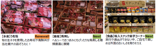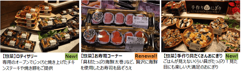 今回の改装では、水産・惣菜売り場に対面調理場を設置し、お買い物の“ワクワク感”をより感じることができる食料品売り場にリニューアルいたします。また、味も見た目もご満足いただけるライフ自慢の新商品が続々登場いたします。今年2月にリニューアルした2階の日用品・衣料品売り場に引き続き、全館リニューアルオープンが実現いたしました。