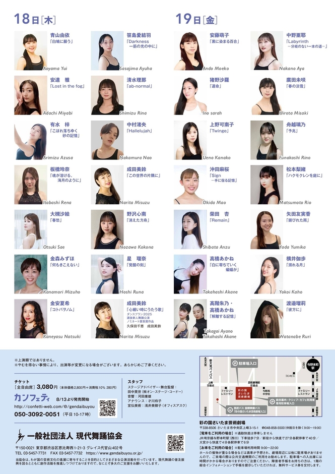 一般社団法人現代舞踊協会主催、令和7年度舞台芸術等総合支援事業(芸術家等人材育成) 現代舞踊新進芸術家育成Project1『選抜新人舞踊公演2025』が2025年9月18日 (木) 〜 2025年9月19日 (金)に彩の国さいたま芸術劇場小ホール(埼玉県さいたま市中央区上峰3-15-1)にて上演されます。 チケットはカンフェティ(運営:ロングランプランニング株式会社、東京都新宿区、代表取締役:榑松 大剛)にて発売中です。