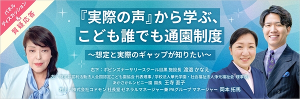 今年は新たな取り組みとして、事前に行うアンケートからのご意見や、セッション中の参加者によるオープンチャット上でのコメントを、リアルタイムでご登壇いただく園長先生方と共有します。普段なかなか表に出せない思いや悩み、 『ほっこり・もやもや』と感じるエピソードを基に、経営者や管理者である園長先生同士で意見交換を行います。本セッションは経験や知識を分かち合いながら、新たな活力を得ることができるセッションです。