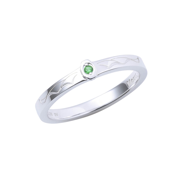 ストレートフォルムのリングに胸元のフリルを取り込み、ブローチをイメージしたグリーンのストーンをセット。内側には名前と本を刻印しました。