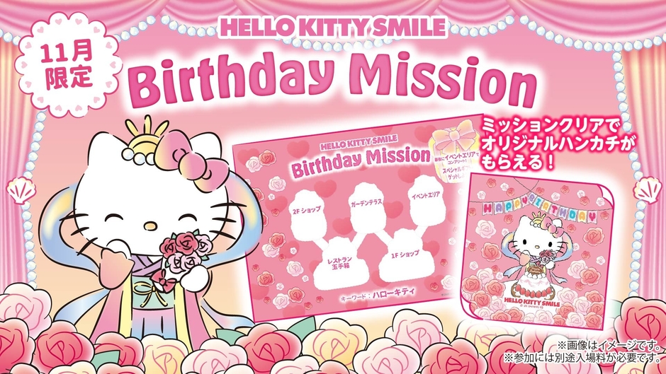 内容: HELLO KITTY SMILEの5つのエリア内にいるスタッフに合言葉「ハローキティ」をお伝えいただくと限定ステッカーをお渡しします。全5種類の限定ステッカーを全て集めると、本イベント限定デザインのハンカチをプレゼント ※無くなり次第終了