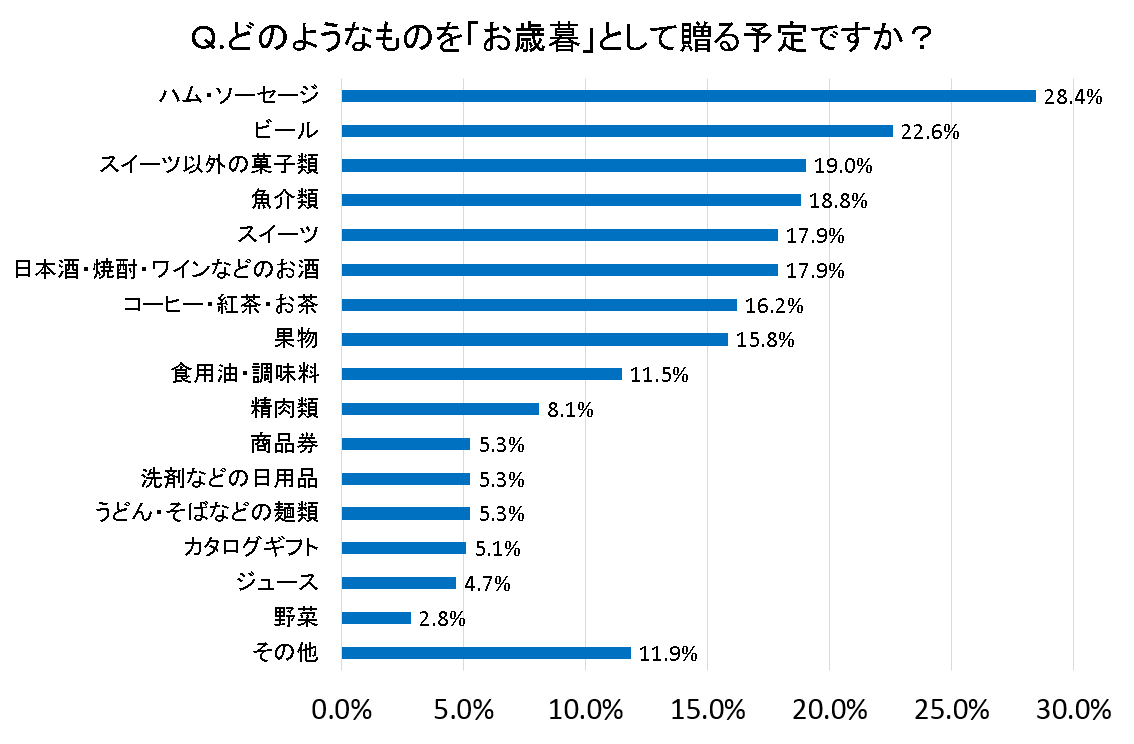 「お歳暮」を贈る予定があると答えた方に、贈る予定の商品について聴取したところ、「ハム・ソーセージ」が28%で1番人気、次いで「ビール」、「スイーツ以外の菓子類」と続く結果となりました。