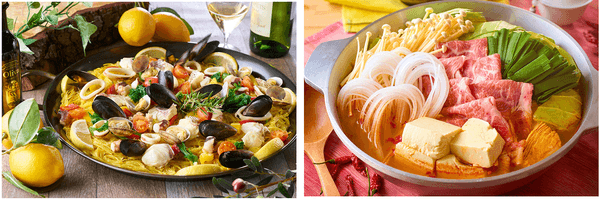 左:サフランライスとたっぷりの具材が目にも美味しい、海鮮パエリア。