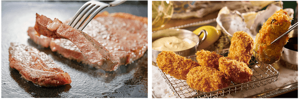 左:ライブキッチンから焼きたてでご提供する不動の人気メニュー、サーロインステーキ(調味牛脂を注入した加工肉です。)