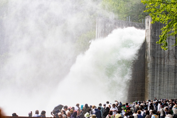 今や春の⾵物詩となっている本イベントでは、⼤迫⼒の放流は午前と午後の2回⾏われます!(各回10分のハイライトは毎秒30トンの放流タイムです)