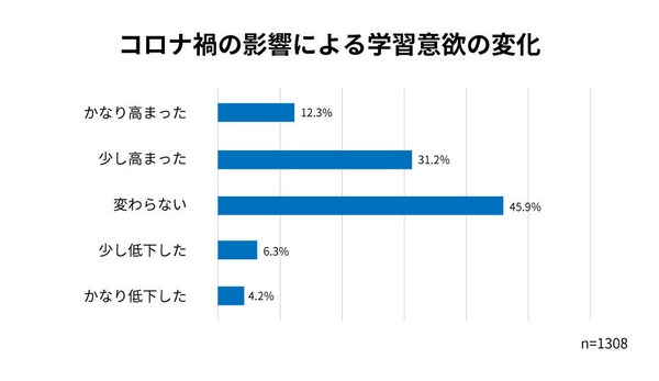「コロナ禍の影響を受けて、学習意欲はどのように変化しましたか」という質問に対しては、45.9%が「変わらない」と答え、43.5%が学習意欲が高まったと回答。意欲が低下した方は10.5%と少数派になりました。